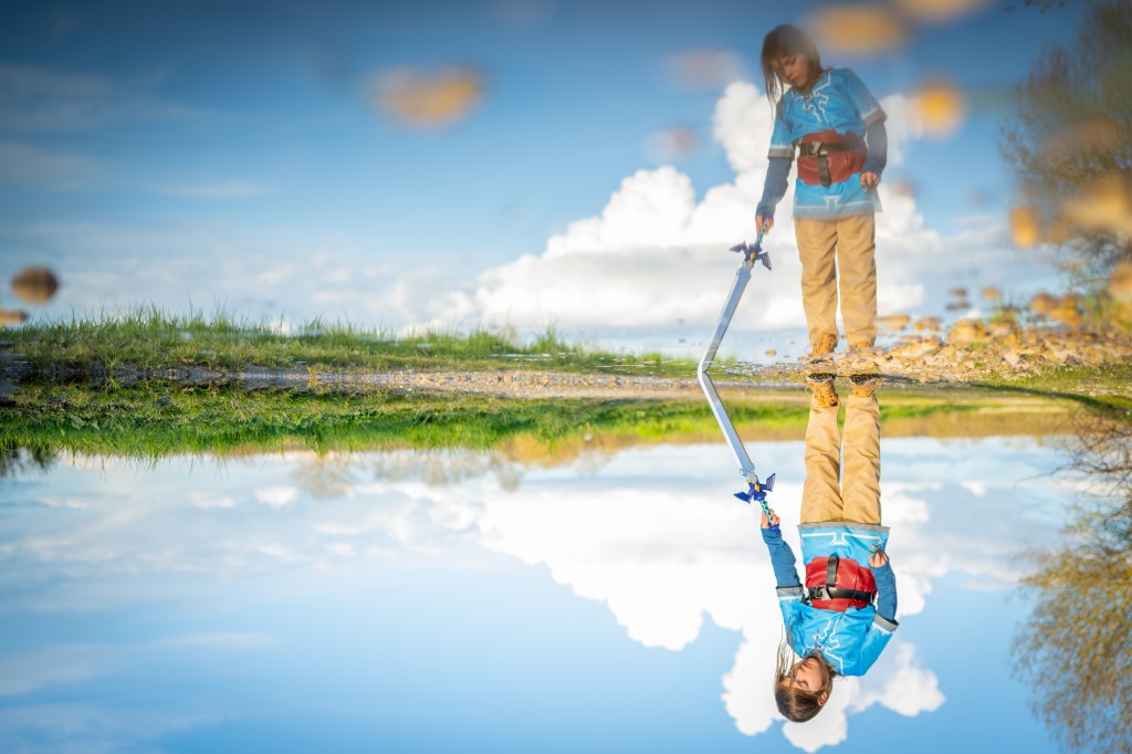 Mais alors qu’il se tournait pour partir, son regard fut attiré par une étrange flaque d’eau scintillante. Elle semblait étrangement calme, comme si elle reflétait un autre monde. Link s’approcha, intrigué, il remarqua alors que la surface de l’eau ondulait doucement, révélant une lueur mystérieuse.
