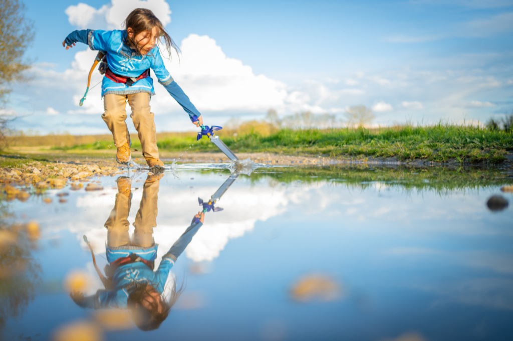 Sans hésiter, il plongea son épée dans l’eau. Une onde de choc parcourut la flaque, et la surface se transforma en un portail lumineux.